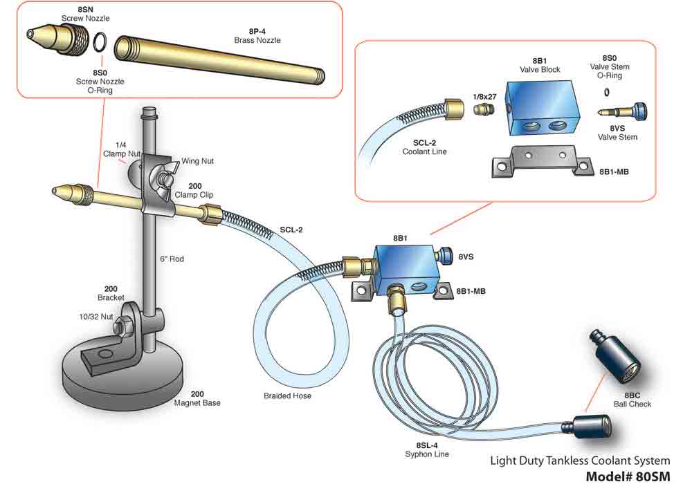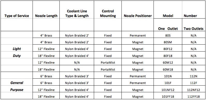 • Easy to Use Control: Output from each nozzle is regulated by a single knob on the control. Mist Spray may be turned on or off instantly to coordinate with the cutting cycle, and the spray mix made lean or rich as needed. Nozzle position can be a permanent mount or the flexible magnetic base. Straight nozzle is standard. 45 and 90 deg. nozzles are available.